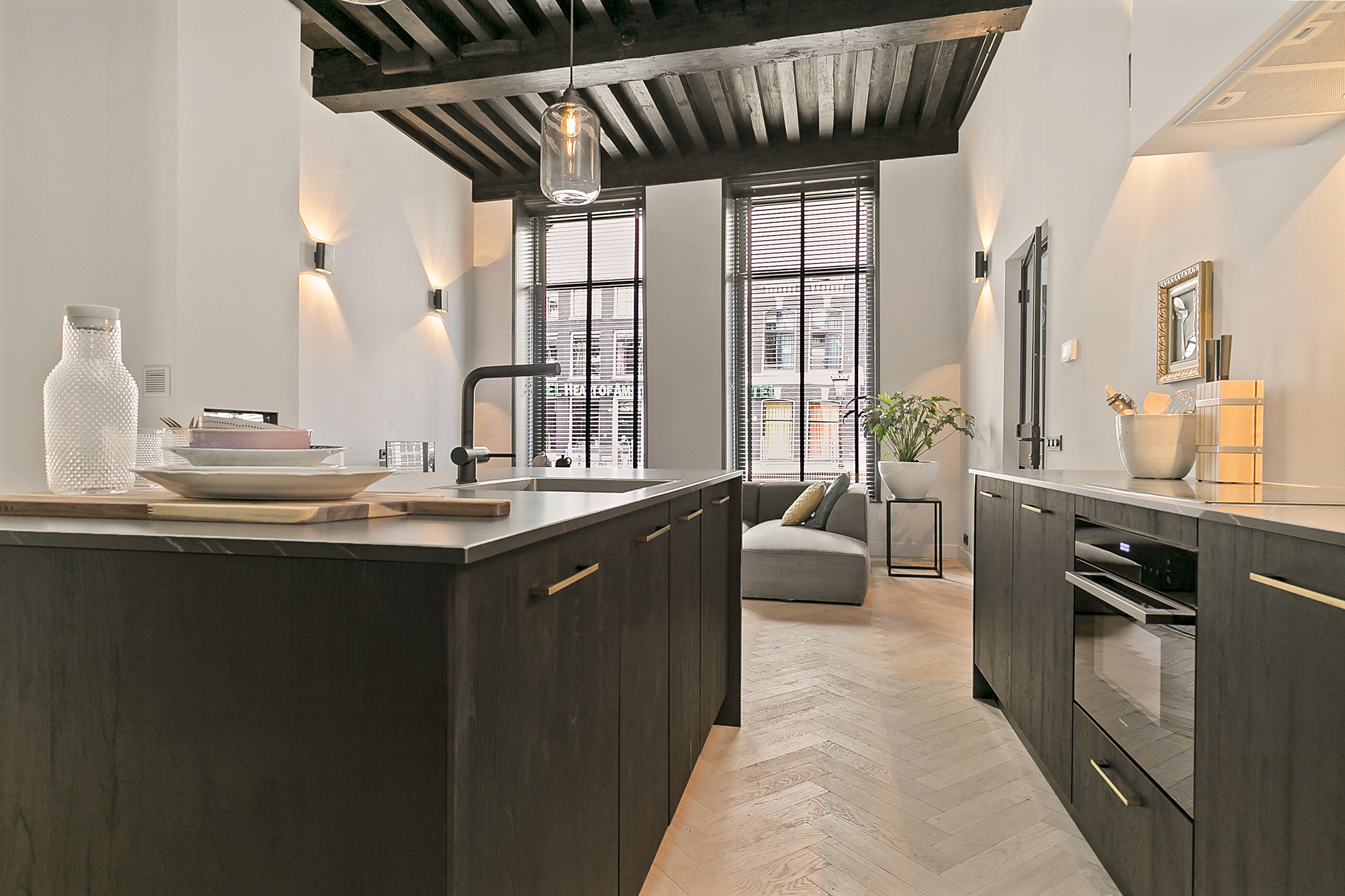 The apartment is located on the corner of Oudezijds Achterburgwal and Koestraat and can be reached via a private entrance on the raised ground floor. The living room has a beautiful wooden ceiling of 4 meters high and provides a very light and spacious feeling. The living room has 2 large windows with a view of the canal and 1 large window with a view of the quieter Koestraat. The living room has an open kitchen with a luxury cooking island containing all necessary kitchen appliances. Together with the stylishly furnished living room with electric fireplace, it gives a nice and cosy feeling where you completely forget the hustle and bustle of the city, even if you live in the middle of it.